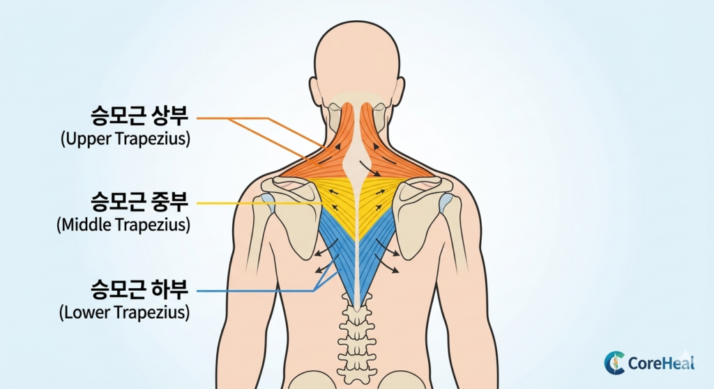 승모근은 뒷목에서 시작해 어깨를 가로질러 등 중간까지 이어지는 큰 마름모꼴 근육입니다. 상부·중부·하부 세 구역으로 나뉘며, 각 구역마다 다른 역할을 합니다.