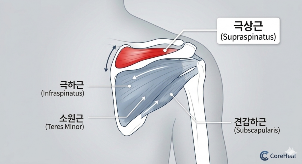 회전근개 중 가장 위쪽에 위치한 극상근(supraspinatus)은 팔을 옆으로 들어 올리는 초기 30° 동작을 담당합니다. 이 근육은 어깨뼈(견봉)와 상완골 두 사이의 좁은 공간을 통과하기 때문에, 팔을 반복적으로 들거나 어깨가 말린 자세에서는 마찰과 압박을 받기 쉽습니다.